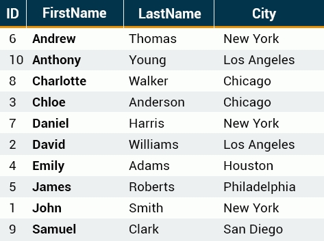 如您所见,行按FirstName列的字母顺序排列。